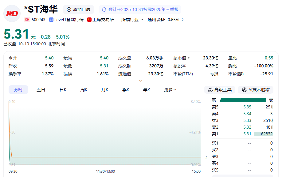 截至10月10日收盘,*ST海华股价跌停,现报5.31元/股,总市值23.3亿元。